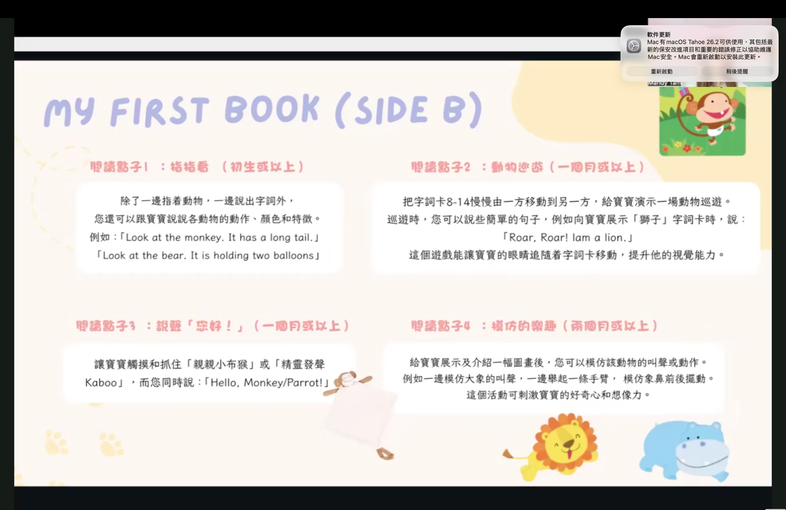 介紹一幅圖畫後,可模仿動物叫聲或動作。