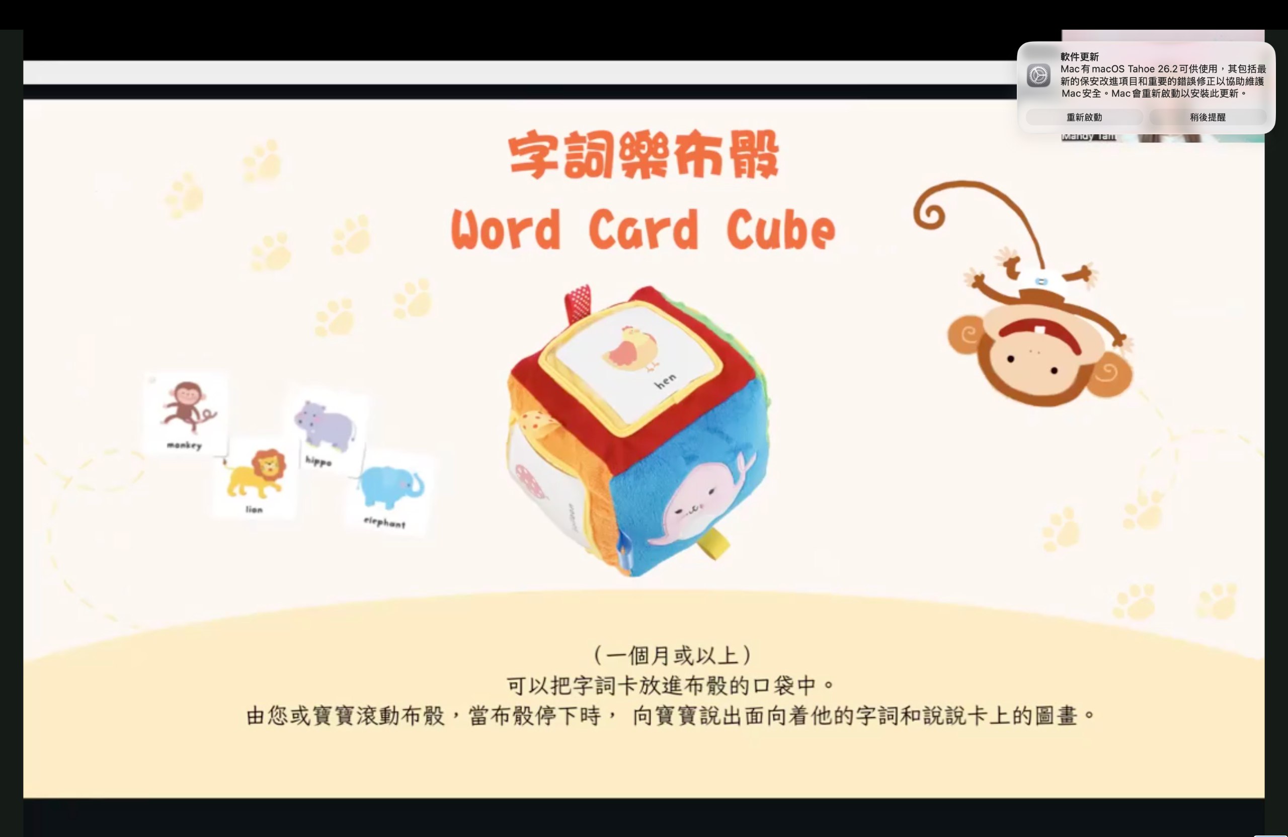 由您或寶寶滾動布骰;當布骰停下時,向寶寶說出面向着他的字詞和說說卡上的圖畫。